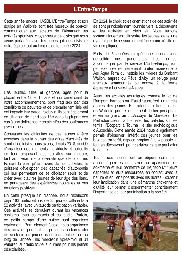 L’Almanach est un support qui a été mis en place pour financer les événements que nous soutenons et aboutir à notre projet final de la création d’une académie des sports paralympiques en Brabant Wallon. Cette revue en A5 est distribuée gratuitement dans les boîtes aux lettres de 5 communes du Brabant Wallon. L’Almanach est imprimé à 24.000 exemplaires et est devenu un guide pour toute personnes recherchant des informations sur les commerçants et leurs activités, les administrations communales.
